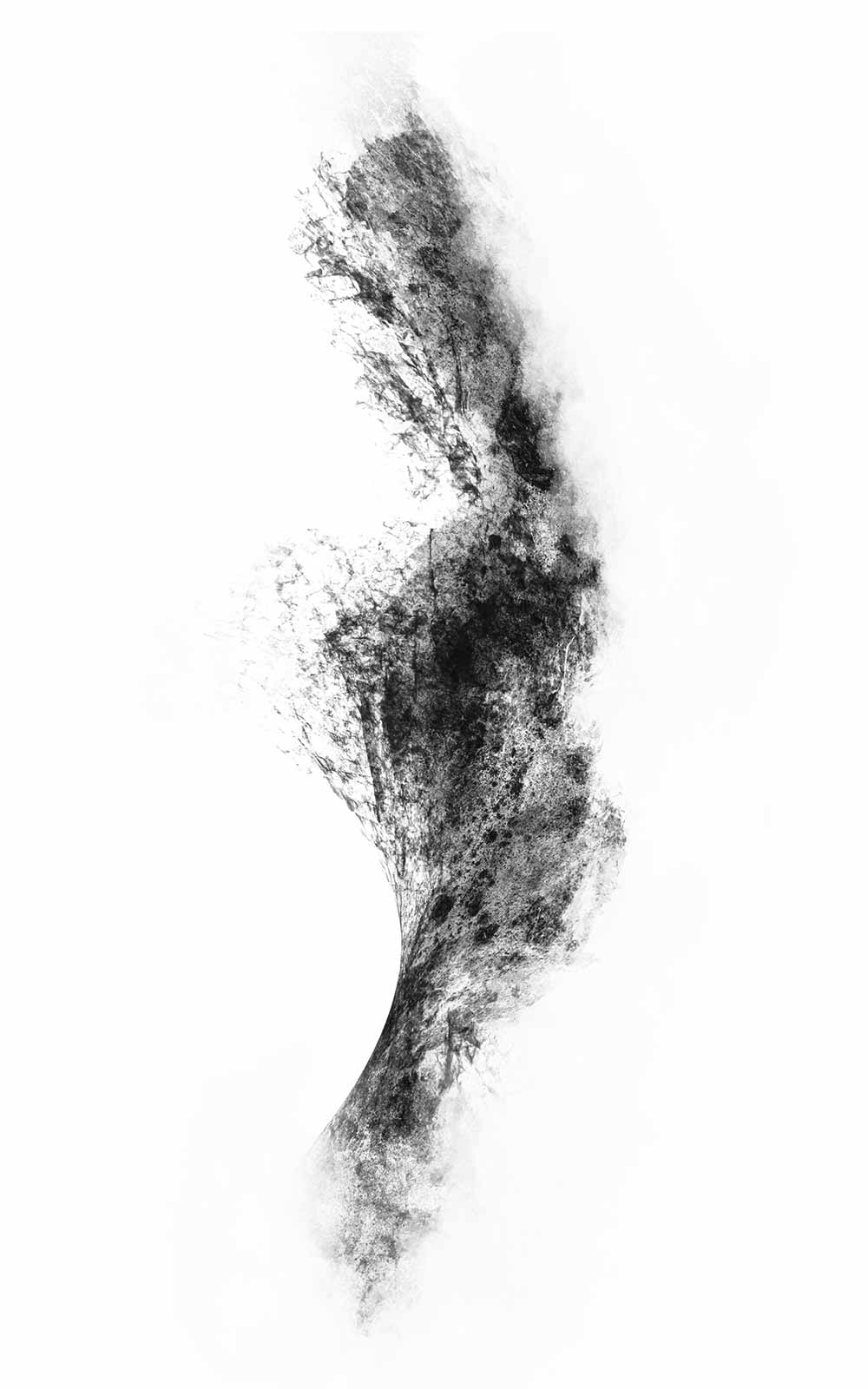 Une forme abstraite, entre trace et effacement, évoque le passage du geste sur la surface.